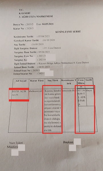 5 Nisan 2021 tarihli ve Kayseri 3. Ağır Ceza Mahkemesi tarafından 2020/3… Sayılı Karar ile “Kişinin kendisini kamu görevlisi ve ya banka, sigorta, kredi kurumlarının çalışanı olarak tanıtması veya bu kurumlarla ilişkili olduğunu söylemesi suretiyle Dolandırıcılık” suçundan 10 Yıl 11 Ay 7 gün hapis cezası ve 937 Bin 500 Lira para cezası ile cezalandırıldı.